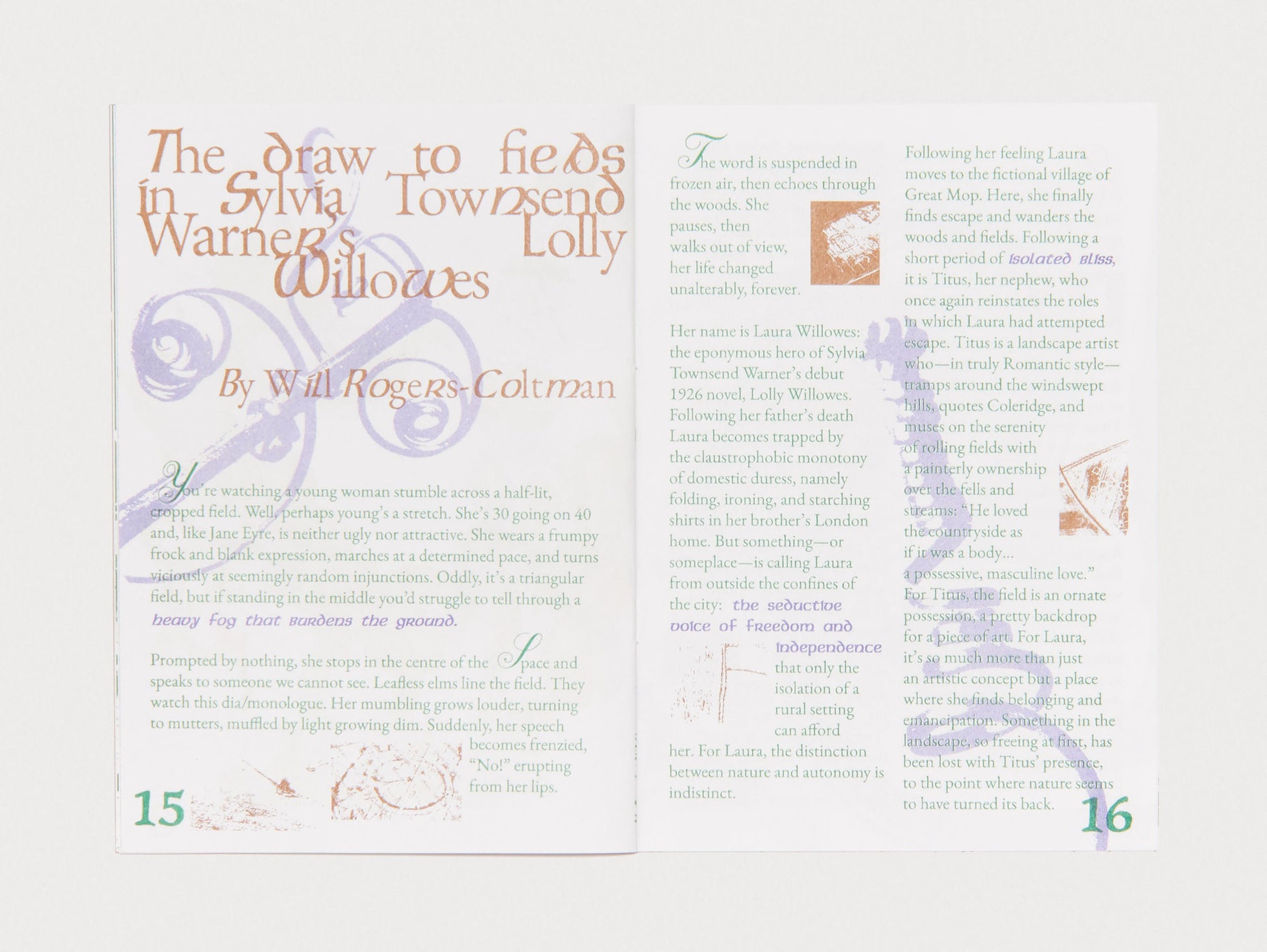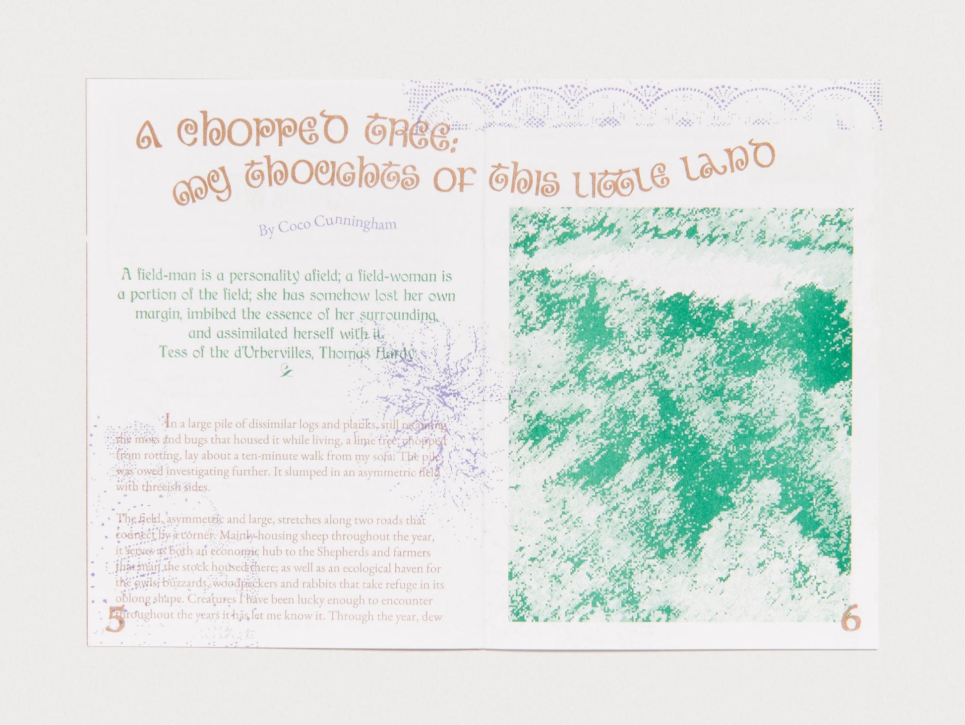 Like a newly planted woodland or a tidal ecosystem, the outcome of RAMBLING was to develop unpredictably. As with any new project, one starts with a seed, unattentively watching it grow until you comprehend its leaf, stem, and bud. My seed felt more of an itch to begin with - an irritating longing for the natural spaces and practices which I grew up around. To scratch such an itch (or sew the seed) I have given RAMBLING space. Space for growth, change, a choice of inhabitant, and surrounding design. So in the spirit of its name, I decided to dedicate this first issue to the field.